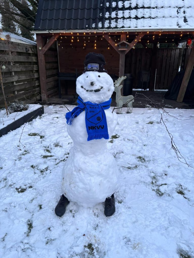 De sneeuw geeft vooral voor kinderen veel speelplezier. Zo ook voor de 28 jarige pubers Niek en Ivana. Zij bouwden deze prachtige sneeuwpop welke warmte ontvangt middels een NKVV sjaal en muts. En wat te denken van de 12 nops voetbalschoenen.