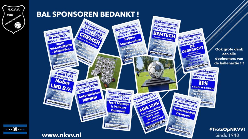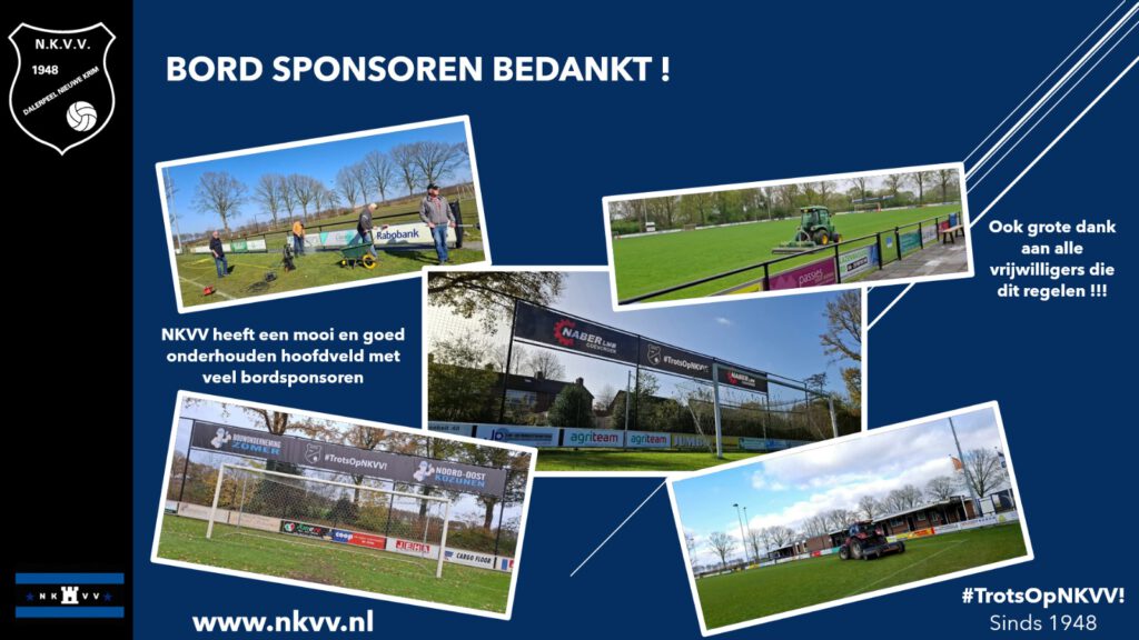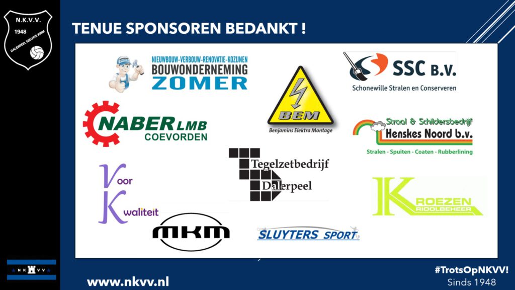 Voetbalvereniging NKVV heeft veel te danken aan sponsoren. De vele sponsoren hebben het mogelijk gemaakt dat de vereniging er jaarlijks tiptop uitziet. Zowel qua sportpark als de volledige kledinglijn, we zijn trots op NKVV!
