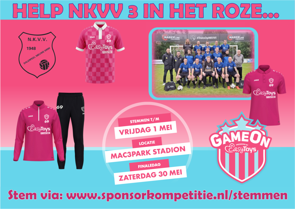 De heren van NKVV 3 glunderen al van blijdschap. Ze hebben zich namelijk stiekempjes ingeschreven voor de GameOn EasyToys Sponsorkompetitie. Met gloeiend roze wangetjes van spanning, wachten ze op jouw stem!