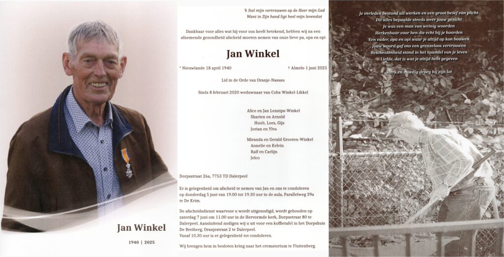 Dinsdagmiddag ontving het bestuur van NKVV het trieste bericht dat NKVV lid Jan Winkel is overleden. Hij was al enige tijd opgenomen in het ziekenhuis in Almelo, alwaar hij zondag 1 juni 2025 is overleden.