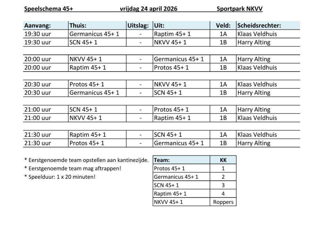Vrijdagavond 24 april mogen de heren van NKVV 45+ weer in actie komen. Op het eigen sportpark, aan de Nassaustraat in Dalerpeel, ontvangt men de teams van SCN, Germanicus, Raptim en Protos.
