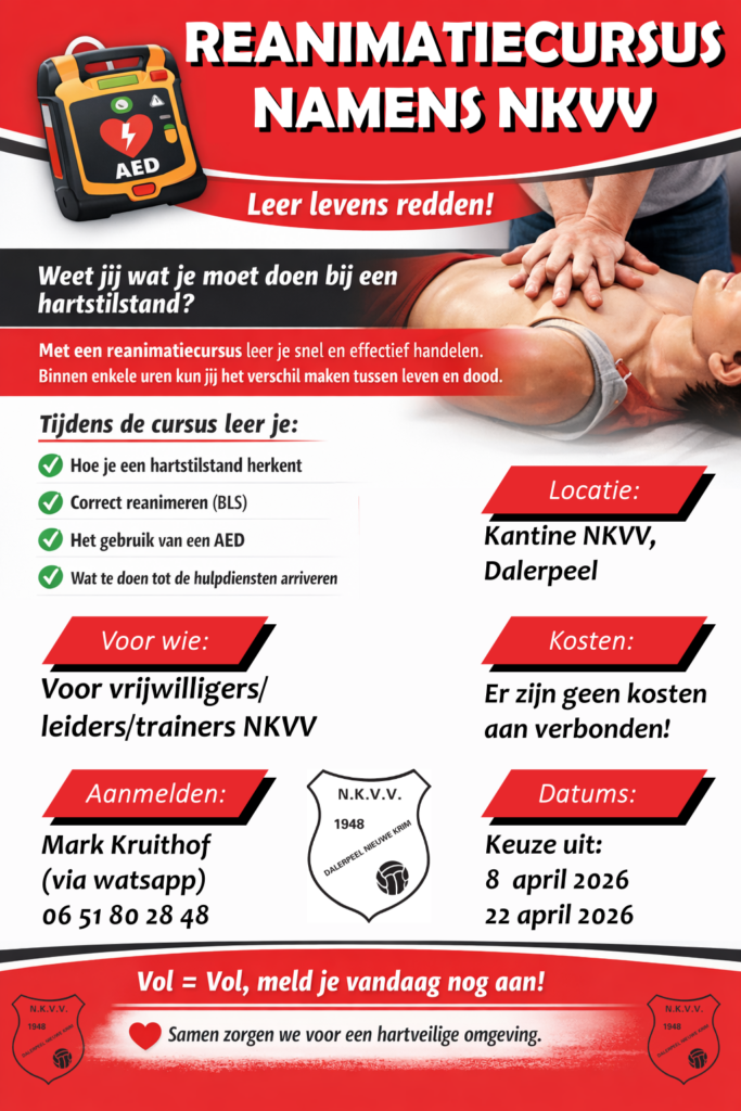 Weet jij wat je moet doen bij een hartstilstand? Met een reanimatiecursus leer je snel en effectief handelen. Voor alle vrijwilligers, leiders en trainers van NKVV organiseert de vereniging een reanimatiecursus.
